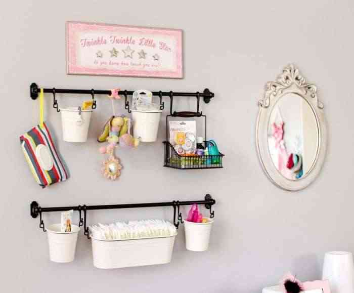Side note: If you’re using a wall area from the ground up, put the most used toys/items on the lower cabinets/shelves, likewise, put the breakables and less used items at the top. By keeping the most used items on the bottom it gives your little one easy access to take out and place back in.