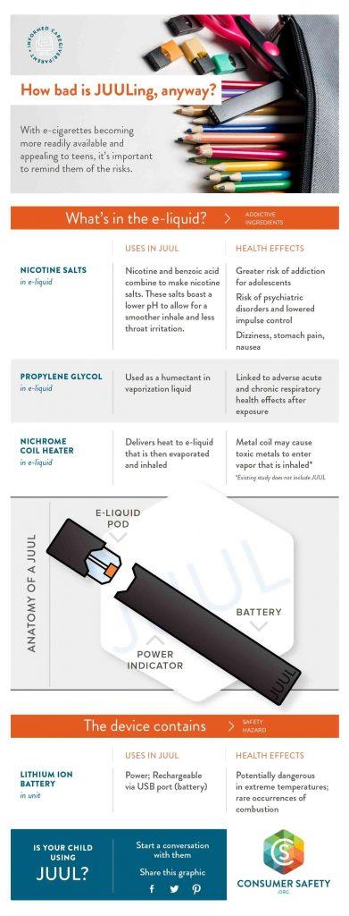 This infographic from ConsumerSafety.org has some great talking points to review with your children included below. Go over this with your children. Teach them the negatives about this “cool” product they have just found out about.
